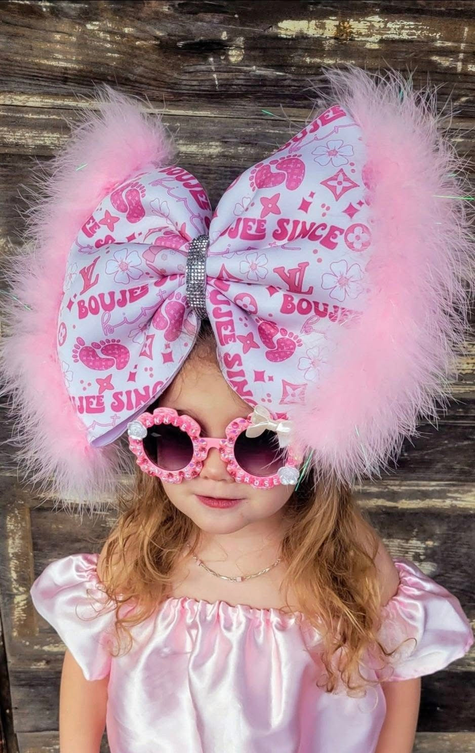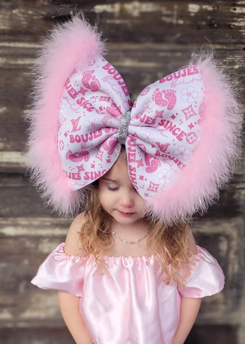 PICTURED: ANNIE WEARING A 10” BOW (BOW SIZE) IN THE CLASSIC STYLE WITH PINK FUR ADD ON ON A CLIP