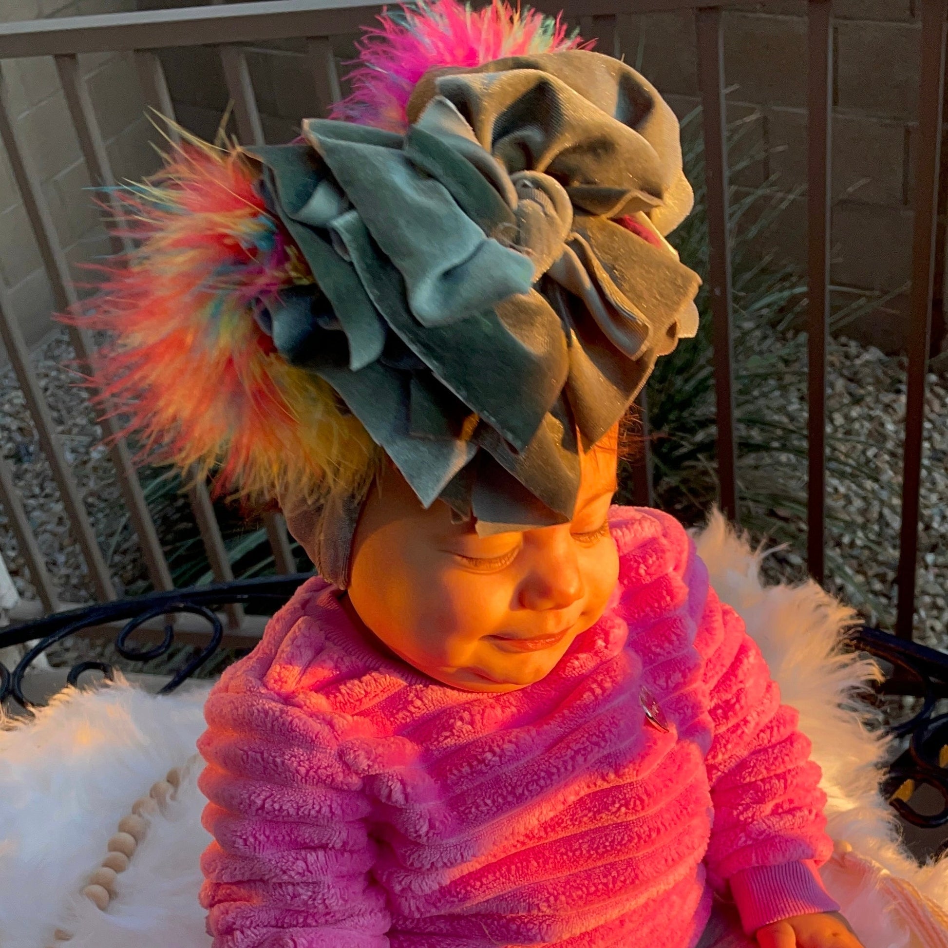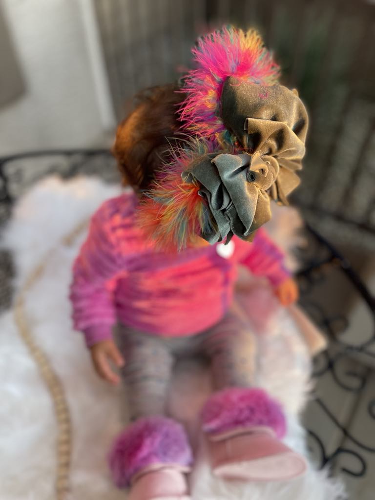 2nd picture- Rose wearing 7”-8” Texas shredded in purple velvet & multicolor feathers