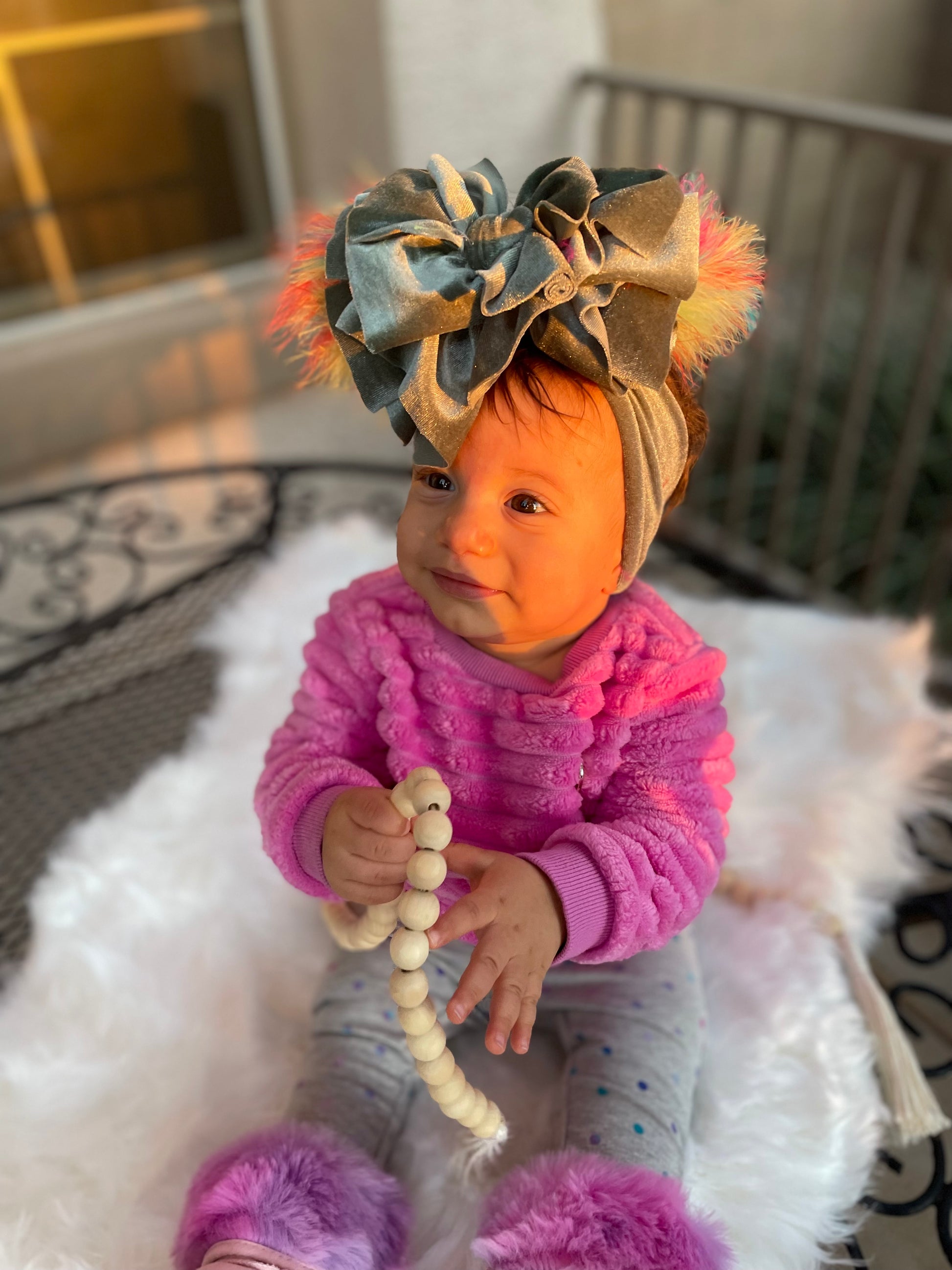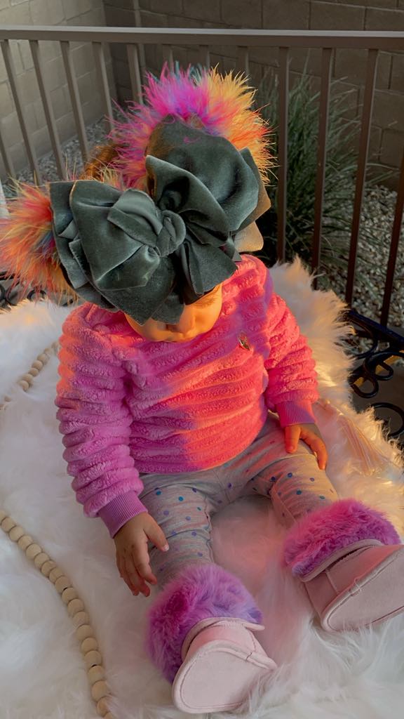 Claire is wearing a 6” hot pink wrap with hot pink feathers